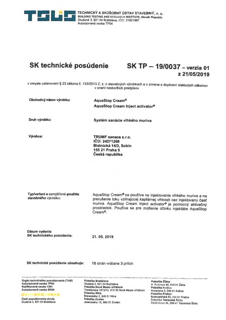 Injektážny krém AquaStop Cream v najvyššej kvalite za najnižšiu cenu v EÚ od výrobnej firmy TRUMF sanace s.r.o.